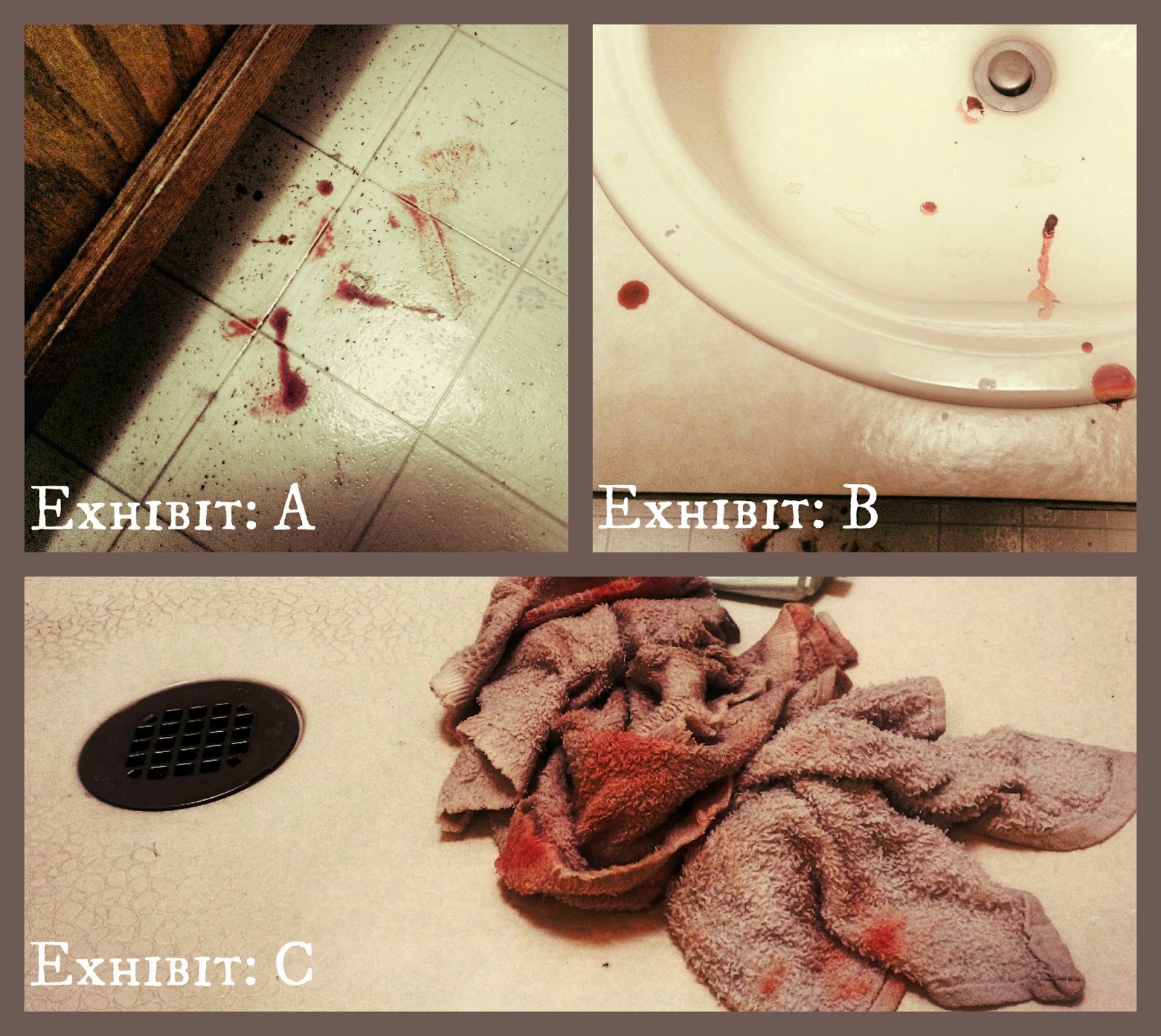 There appeared to be a crime scene in my powder room. There was a zigzag trail of bloody footprints between the vanity and the shower. There was blood spatter on the mirror and down the side of the toilet, and there were three blood-soaked washcloths in the sink.